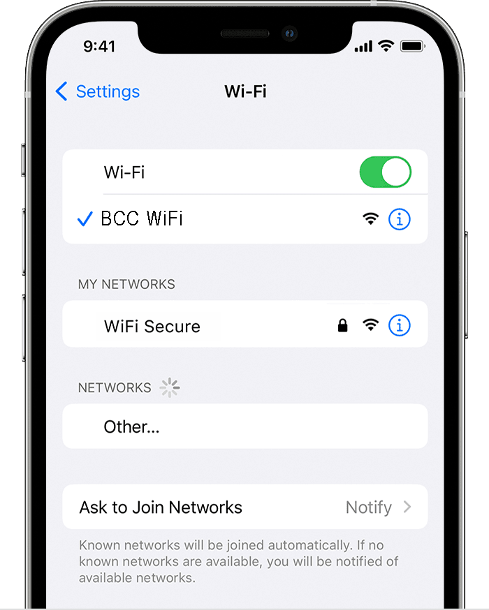 - Tap the name of the BCC WiFi network that you want to join. Before you can join the network, you might be asked to enter the network’s password or agree to terms and conditions.